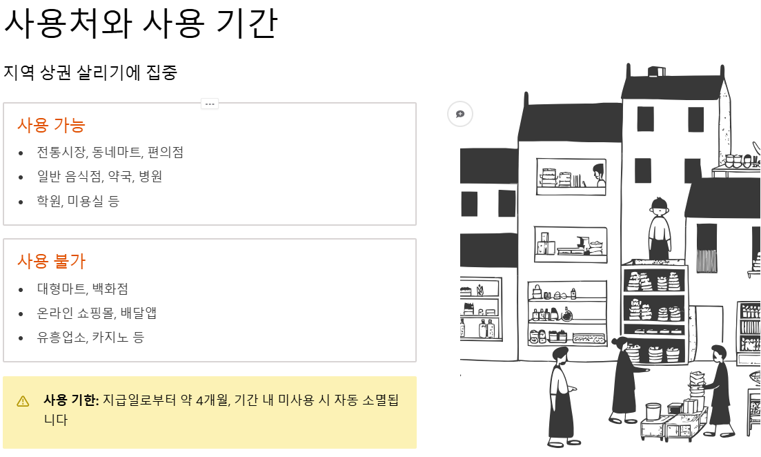 | 전통시장 | 재래시장 내 식료품점, 의류점, 잡화점, 소형 슈퍼마켓 등 | ○ (사용 가능) | 지역경제 활성화 목적 부합 |