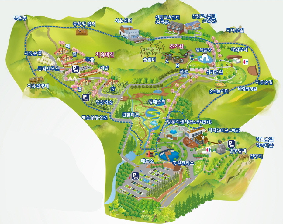 - 공원 내에는 치유센터를 중심으로 숲 해설, 요가·명상 등의 치유 프로그램이 운영되며, 100% 사전 예약제로 운영됩니다.