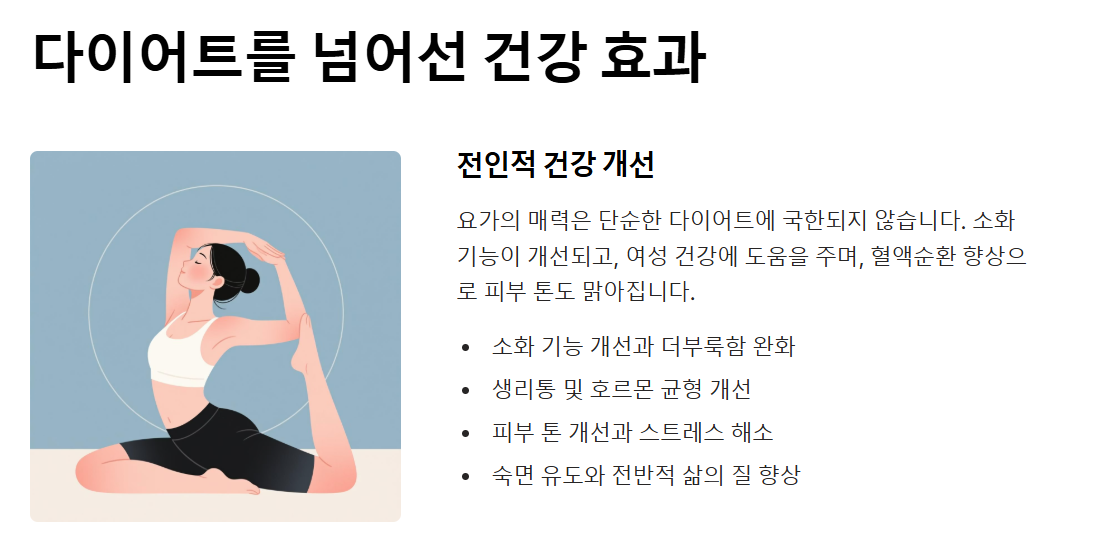 - 소화 기능 개선 : 꾸준한 요가는 장 운동을 활성화시켜 더부룩함을 줄여줍니다.